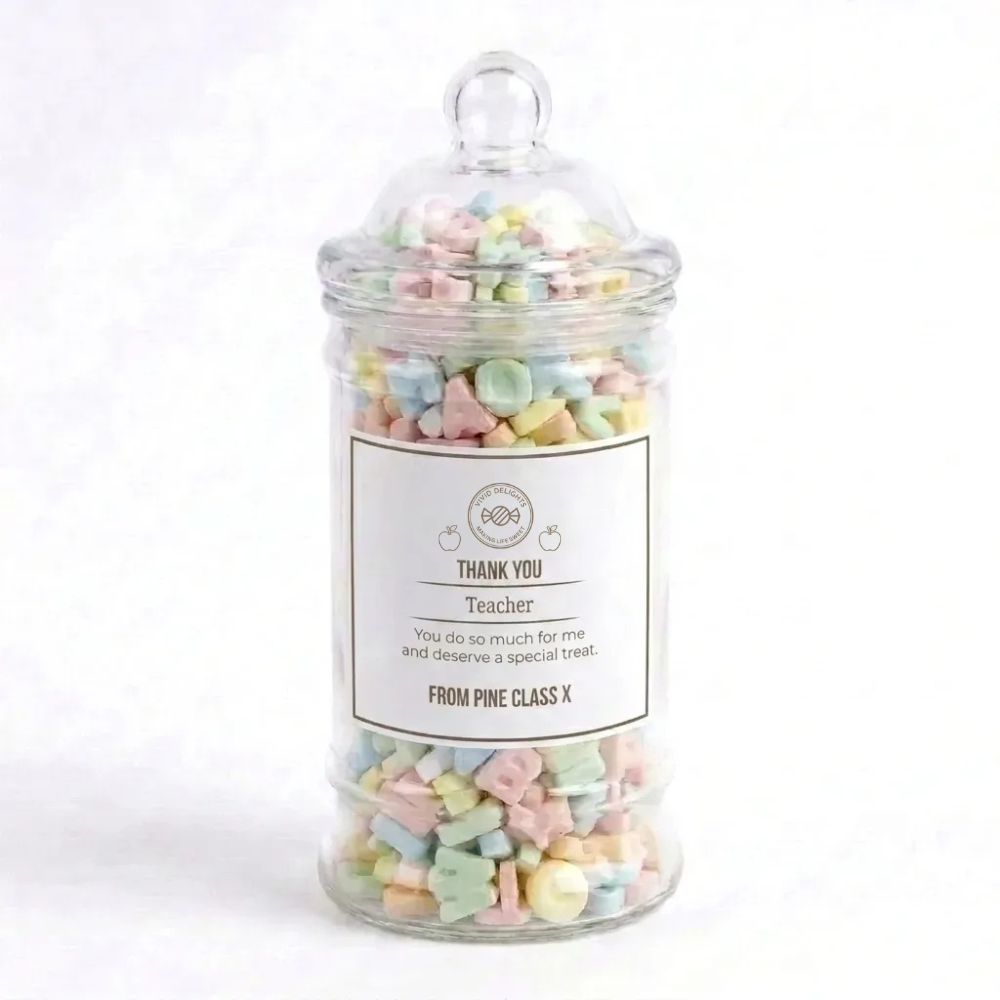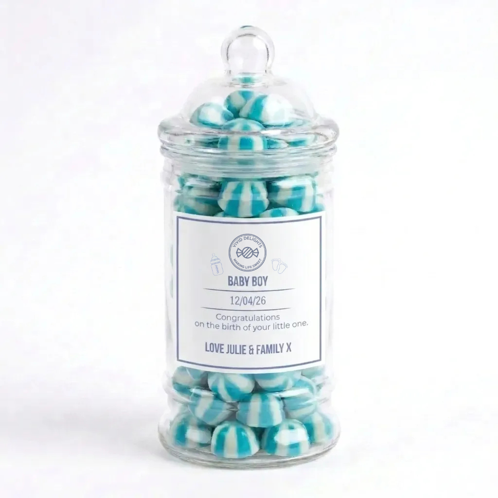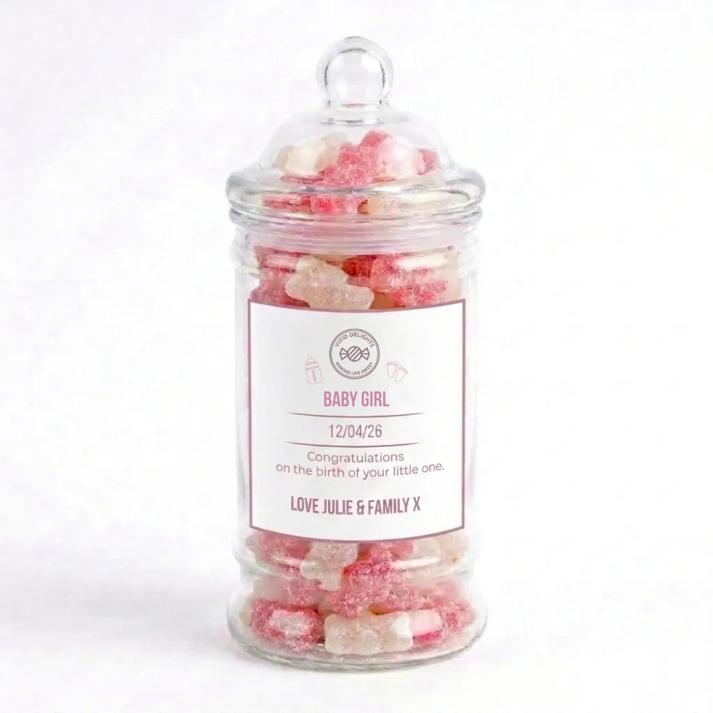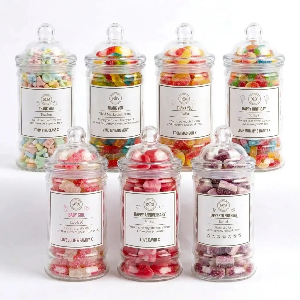 Four short steps, ten minutes, hand-filled by us. Pick the jar, the sweets, design the label with their name on it, and we'll print, pack, and post on the day.